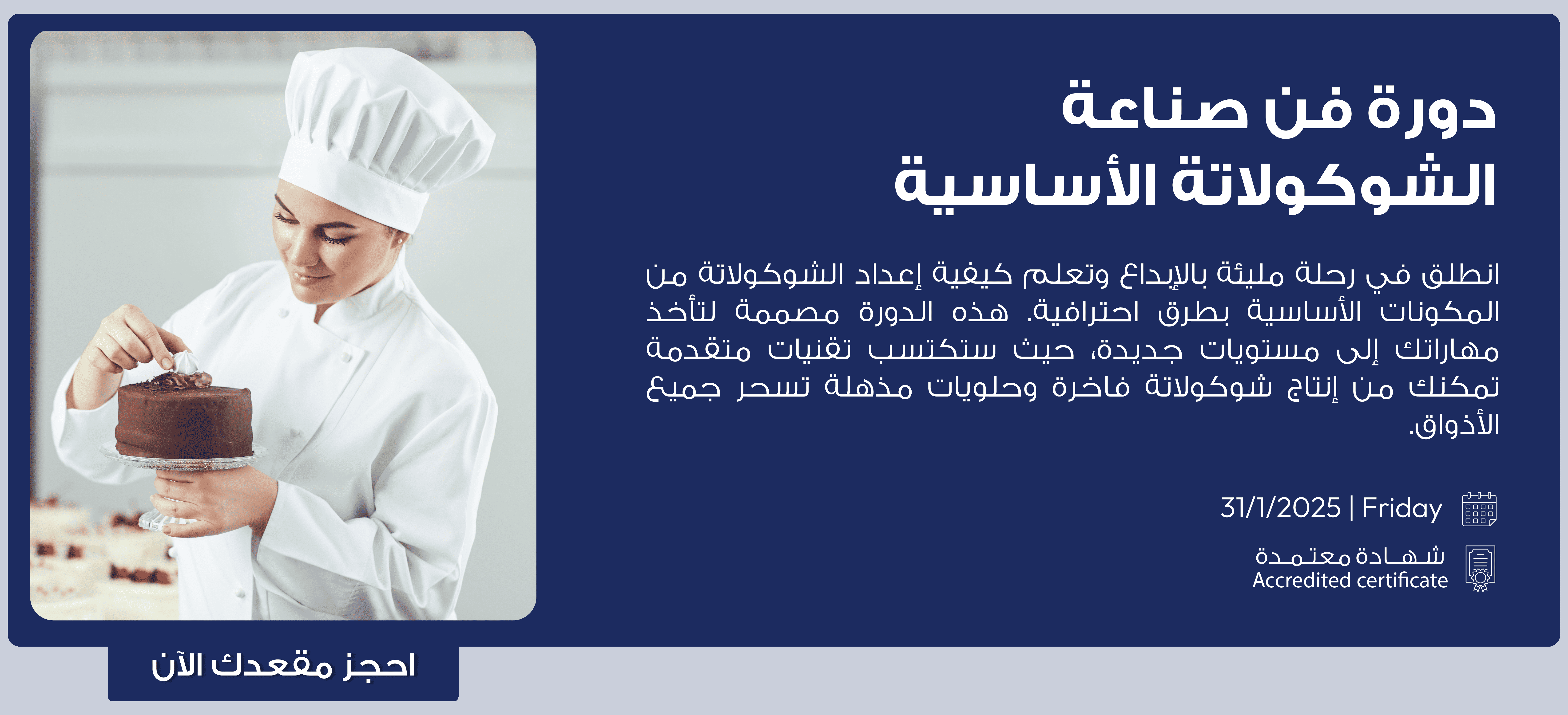 تختار أكاديمية الطاهي المبدع لعدة اسباب 1- تعليم محترف: يتم تقديم الدورات من قبل طهاة محترفين ذوي خبرة عالية. 2-بيئة تعليمية تفاعلية: نقدم تجربة تعليمية شاملة تضم الأدوات اللازمة والمشاركة الفعالة. 3-شهادة معتمدة: ستحصل على شهادة تعبر عن مهاراتك في صناعة الشوكولاتة والمخبوزات، مما يمكنك من خطوة جديدة في مسيرتك المهنية.